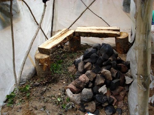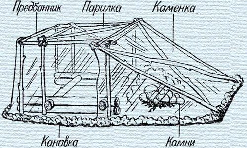 Докато камъните най-накрая се затоплят, трябва да имате готова парна баня. По-лесно е, разбира се, да се построи хижа като индийски вигвам. Но е лошо, защото топлината ще се събира в горния конус, а жалките трохи ще останат на долния слой, където хората действително се реят.