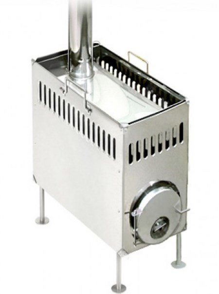 | Размери - 700/280/415/80. Броят на коминните тръби, с дължина на всеки сегмент от 500 мм - 5 бр. Корпусът е изработен от топлоустойчива стомана, дебела 0,8 мм, а защитните екрани са 0,5 мм. Размерите на камината са 520/195/180. Тегло без камъни - 13 кг. | Конструкцията има голям запас на безопасност, което е важно за подреждане на достатъчно количество камъни. Освен това може да се използва за отопление на палатката, готвене. За полагане на камъни е направена специална кухина. Усилвателите са направени, за да се предотврати деформация на тънкия метал на частите на пещта. | От 10000 |