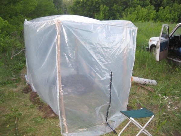 За да се предотврати пробиването на полиетилена през острите ъгли на самоделната рамка, те трябва предварително да бъдат увити в някои парцали. Освен това трябва да изкопаете малка яма за полагане на камъни в далечния от входния ъгъл на парната баня и да изкопаете улей от тази яма до огъня.