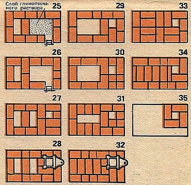 Първият тухлен ред се полага върху пясъка (12 парчета тухли се използват без закрепване) строго хоризонтално, което може да се провери с ниво. Върху първия ред нанесете тънко глинен разтвор и монтирайте вратата на вентилатора. Предварително увийте вратата с парче азбестов картон или го увийте с шнур. Закрепете го с тел.