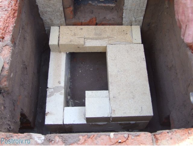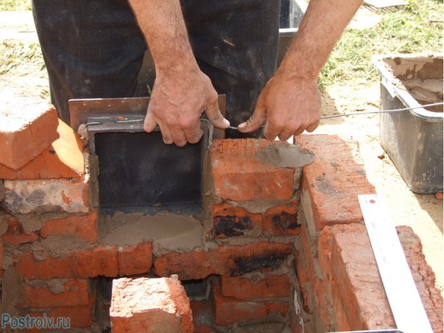 - Разпределете ниша с размери 0,75х0,5х0,5 м. Поставете ред тухли над тази ниша (зидария с лъжица). Тук използвайте опората от предоставените метални ъгли. Инсталирайте ъгъла с еднакъв фланец в задната част на реда (в 8-ия ред на зидарията) и 30x40 отпред, правейки прорези в предната тухла на 9-ти ред за ъгловия рафт.