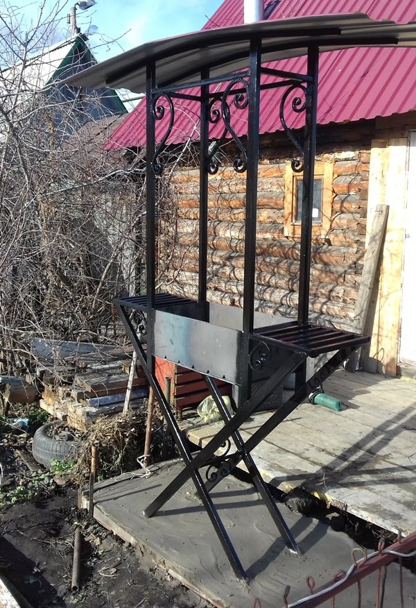 Ако направите мангал със собствен покрив, тогава можете да готвите вкусни ястия на дървени въглища при всякакви полеви условия. Валежите няма да досаждат на готвача и въглените няма да се заливат с вода.