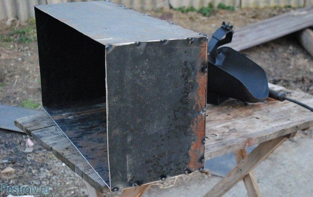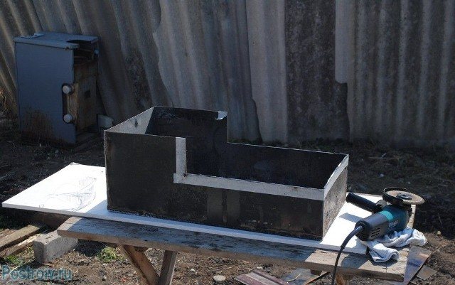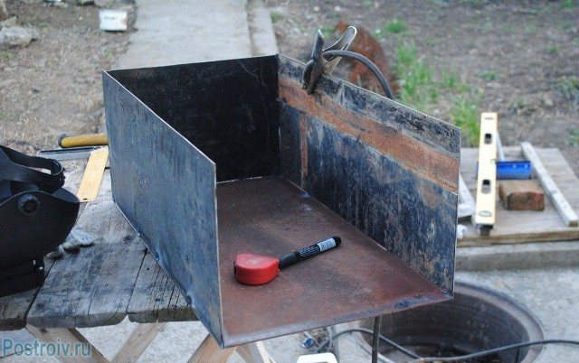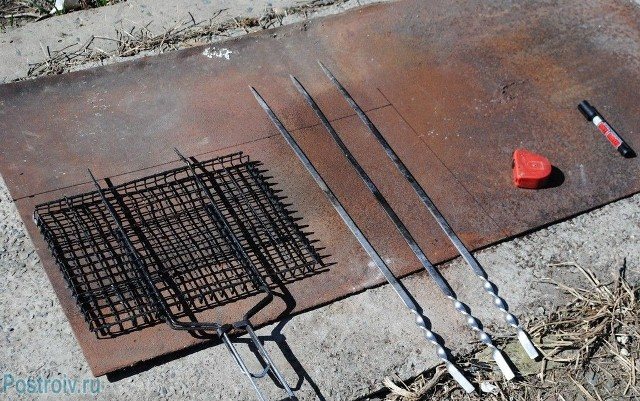 Втората версия на метално барбекю е по-сложна. Като цяло, за тези, които искат да получат подобен продукт с подобрени характеристики на работа. Основните предимства на това барбекю в сравнение с предишното са наличието на високи крачета, рафт между тях, дръжки за носенето му, както и двойно дъно, което ще осигури по-равномерно изгаряне на въглища или дърва за огрев. Сега нека поговорим за всичко по ред. Вземаме метала и го маркираме на дъното и стените.