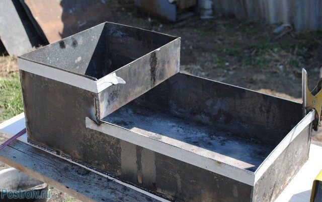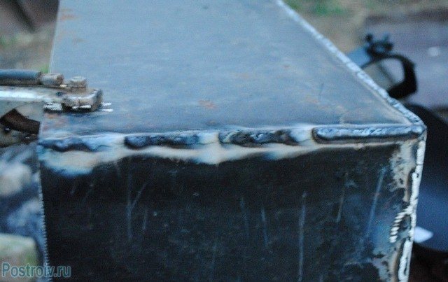 - С помощта на квадрат, страничните стени се захващат чрез заваряване перпендикулярно на дъното и след това шевовете се заваряват по цялата линия на опората.
