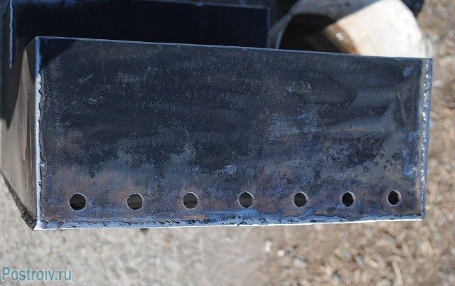 - С бормашина с диаметър най-малко 12 мм се пробиват отвори за въздушен поток в долната част на страничните стени или дъното, в зависимост от това кои чертежи използвате, когато правите мангал със собствените си ръце. Ако въздушният поток ще бъде през дъното, трябва да се осигури допълнителна долна кутия за пепел.