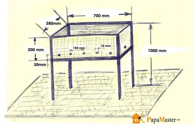 - Ако планирате да направите мангал със собствените си ръце от метал с малка дебелина за пътувания на открито, чертежите на рамката могат да бъдат оставени настрана. Няма да имате нужда от него. По-добре е да заварявате къси (до 8 см) парчета метална тръба с диаметър до 25 мм в ъглите на дъното, в които парчета пръчка или тръби с по-малък диаметър (до 20 мм) ще бъдат вкарани като крака. Тяхната дължина се избира въз основа на техните нужди.