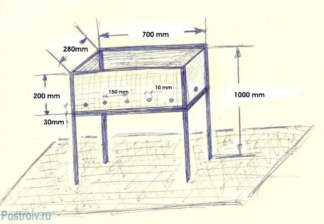 Отгоре опарваме квадратния корпус с тръба и правим прорези за шишчета.Изрязваме и две дупки в долната част, така че въздухът да минава под „второто“ дъно.