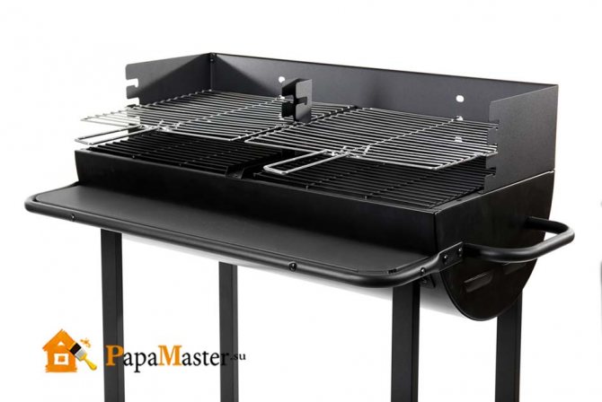 - С комбинирани опори. Огнището е заварено към стълбовете, като е едно цяло с тях. Недостатъкът на това решение е, че страничните стелажи ще се нагреят и не могат да се използват за съхранение на аксесоари.