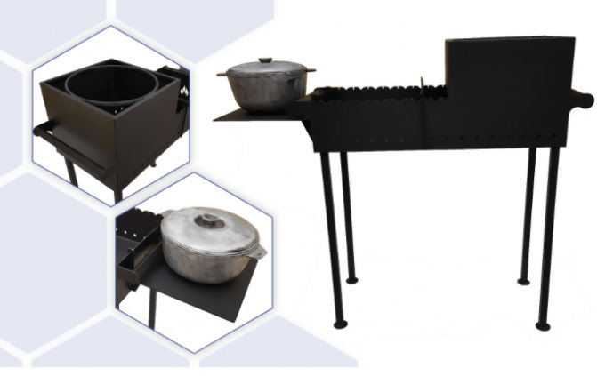 - Функционалност. Дизайнът може да се използва за готвене на шишчета, решетка и в котел. Конструкциите могат да бъдат оборудвани с рафтове и куки за съдове, дървена поставка, качулка и сенник.