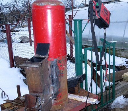 Устройство от газова бутилка е по-трудно да се изгради, но значително увеличава ефективността. За монтажа на конструкцията е необходима цев или газова бутилка.Дървата в горивната камера изгарят поради притока на кислород чрез зареждане през специален прозорец.