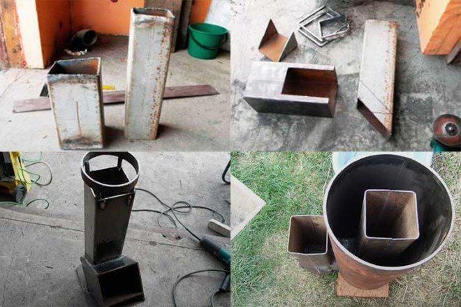 Ако трябва да съберете ракетна фурна със собствените си ръце, трябва да използвате чертежа на преносимия модел "Робинзон", той е изграден от остатъци от профилна тръба и метална опора на краката. Цялата работа се свежда до заваряване. Схемите са доста променливи, те позволяват използването на тръби от различен участък, в този случай всички параметри трябва да бъдат коригирани спрямо пропорциите.