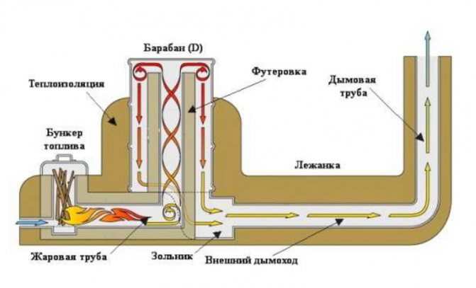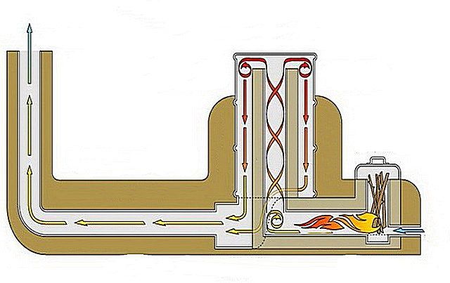 Продуктите от горенето, които имат висока температура, се издигат до камбаната, постепенно се охлаждат, спускат се между стените и преминават в комина. Те са засегнати от естествената тягова сила в този канал, новите газове, идващи от горивната камера, и гравитацията оказват влияние. За да се събере възможно най-много топлина и да се насочи към отопление на стаята, към печката са прикрепени димни канали със сложна конфигурация - те са положени в основата на леглото.