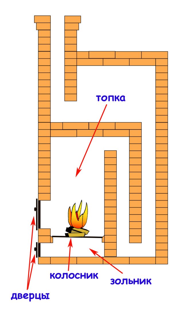 Особеността на схемата за подреждане на пещта се крие в различната дебелина на стените на каналите за циркулация на дим. Първият от тях, идващ от горивната камера, се нарича огнен канал. Има 3/4 тухлена външна стена. Останалите му стени са поставени в половин тухла.