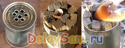 Малки дърва за огрев, сухи конуси, малки клони се зареждат в среден буркан и се запалват. Когато печката е добре осветена, тя се покрива с домашна горелка, върху която се поставя черпак или кана.