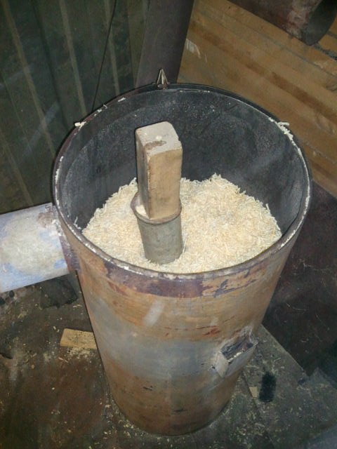 Когато стърготините са подредени до самия връх, тръбата се изтегля. По този начин дървените стърготини се подреждат в пещта, така че получените продукти от горенето ще бъдат издухани от въздушния поток (тяга) в шахтата, образувана от тръбата.