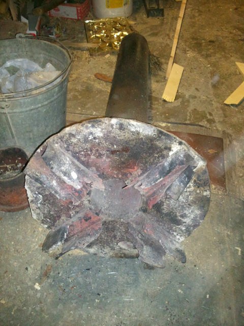 Диаметърът на кръга под налягане трябва да бъде малко по-малък от диаметъра на резервоара за гориво. Това ще осигури свободното му движение в пещта при изгаряне на горивото. В центъра на кръга под налягане трябва да се изреже отвор, равен на диаметъра на захранващата тръба. След това каналът се нарязва на 4 равни секции и се заварява към кръга. Това е необходимо, за да се увеличи теглото на колелото под налягане и да се осигури допълнителна здравина на конструкцията.