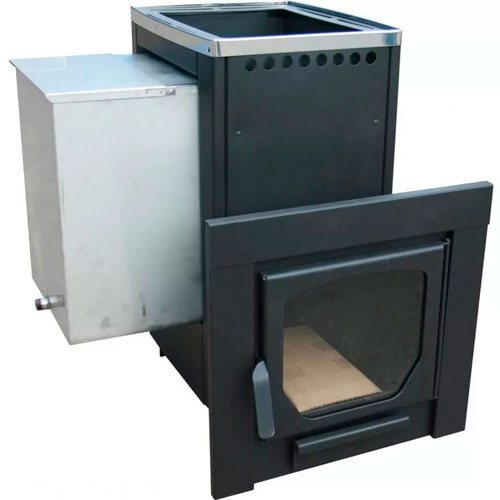 Много финландски печки с дървен резервоар за вода за баня са направени по тази схема. Например такива устройства се произвеждат от Harvia.