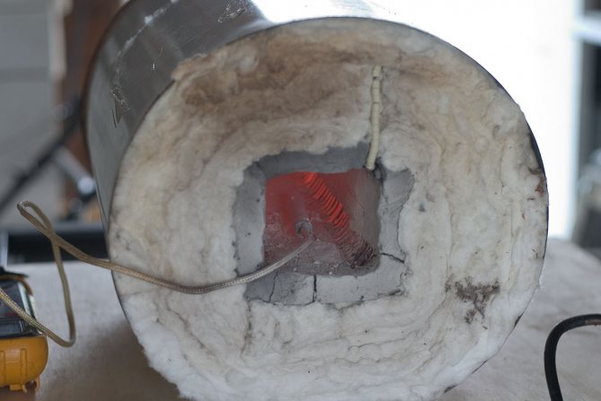 Цилиндър с базалтова вата е монтиран с края си на хоризонтална равнина. Шамотни тухли са поставени отдолу, за да предпазят кръглата стена от високи температури. Вътре е поставен нагревателен елемент и всички кухини са запълнени с топлоустойчиво лепило. Изсъхването на устройството ще отнеме няколко дни. През това време можете да измислите и да направите врата за фурната. Колкото по-плътно затваря горивната камера, толкова по-дълго ще служи домашната спирала. Самоизграждащата се муфелна пещ е способна да топи благородни метали, да пече глина, да топи някои метали.