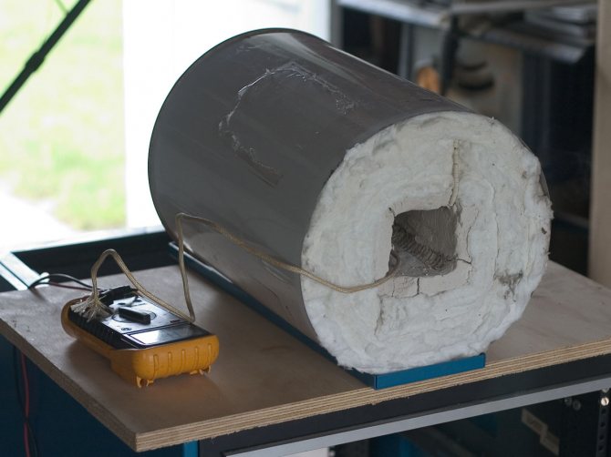 От вътрешната страна стените на получения цилиндър са обвити с базалтова вата. Този материал не е избран случайно. Ограничителната температура при контакт с открит огън е 1114 ° C градуса, материалът има лоша топлопроводимост, която просто ни е необходима при тези условия, а също така е безопасен за човешкото здраве дори при критични температури.