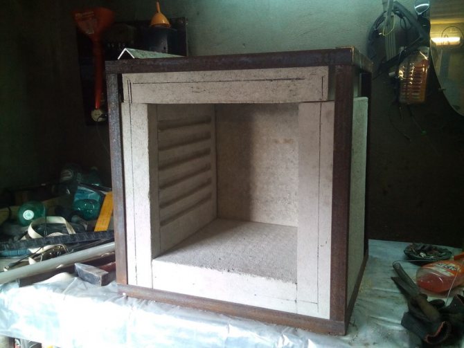 - ламарина или всякакъв материал под ръка. Ако имате стар сейф с вътрешен слой пясък, значи имате късмет. Такава пещ ще продължи дълго време и ще спести на външния слой на топлоизолация;