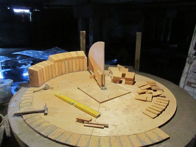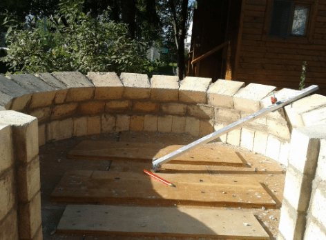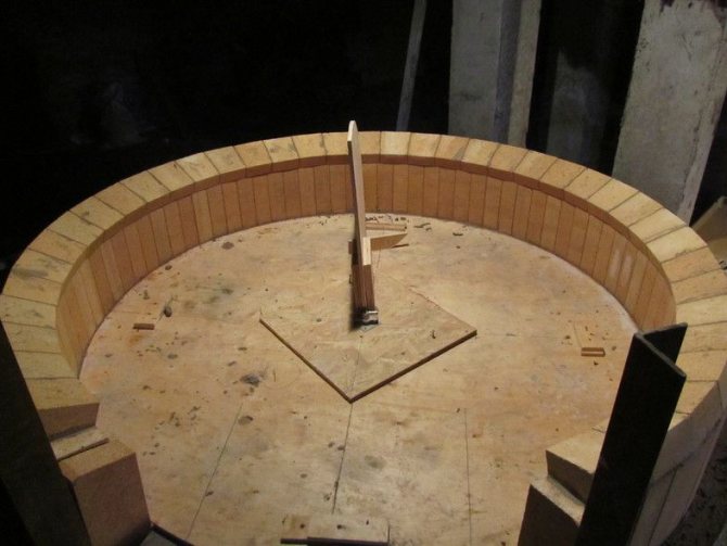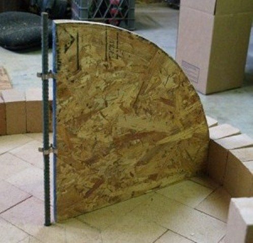 | Инсталиране на шаблон. За да изложим тухлена полусфера, имаме нужда от шаблон. Има няколко вида такива дизайни, ще покажа най-често срещаните и вие вече решавате кой ви подхожда. На тази снимка шаблонът е релса, прикрепена към панта в центъра на кръга. Ограничителният ъгъл се привлича към релсата чрез скоба, в основата е сглобяем шперплат.