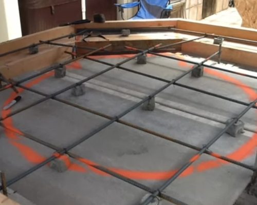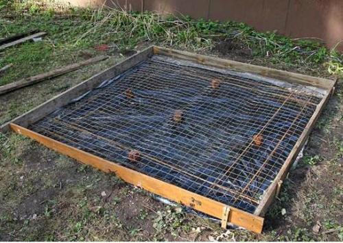 | Укрепване на основната плоча. Стандартната дебелина на основната плоча е 100 мм, но ние правим кофража с височина 200 мм. Първоначално върху подиума се поставя лист от водоустойчив шперплат или OSB и по него вече се събаря кофражна кутия. След това изплетете подсилваща клетка и я поставете вътре. Тази клетка се издига на височина от 3-4 см, като отново използва счупени тухлени подложки.