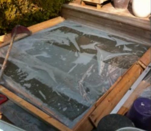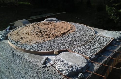 | Изливане на основната плоча. Основната плоча се излива точно по същия начин като основата, с дебелина само 100 мм. След изливането се покрива с полиетилен и периодично се овлажнява, изчаква се да стане по-силна поне 2, а най-добре 3 седмици. На следващия етап от създаването на основната плоча ще оборудваме топлоизолацията за огнището на помпейската фурна и тук има 3 възможности за монтаж. |