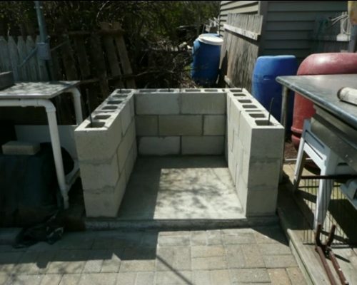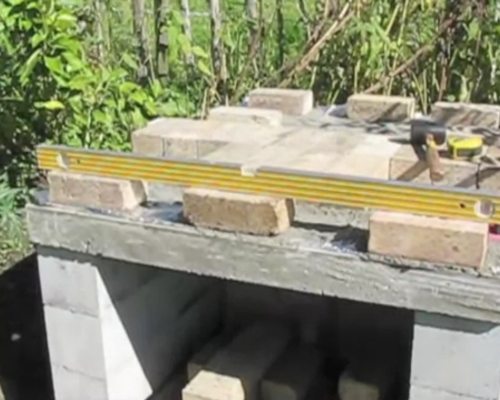 | Полагане на редовете. Подиумът може да бъде направен под формата на буквата "P", не е важно, основното е, че ъглите получават редовен квадрат 1,2x1,2 m. В случая на шлакоблок това е просто, там размерът на блоковете е 200х200х400 мм, сложих три блока и вече има необходимия размер. |