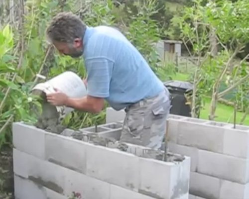 | Укрепване на подиума. Направих подиум с височина 4 шлакови блока, тоест 800 мм, ако ви се струва малко, можете да направите 5 шлакоблока (1 м), но не повече, защото отгоре ще има и основа плоча с дебелина 200 мм. Шлаковият блок е кух материал и за увеличаване на здравината му допълнително вмъкнах армировка в него и отгоре излях бетон. |