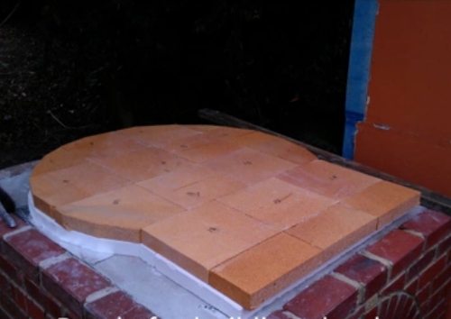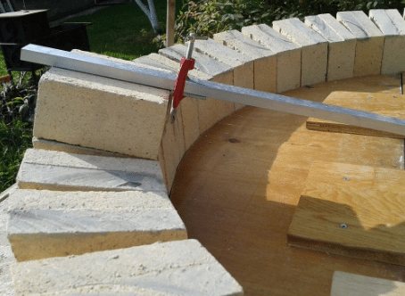 | Завършване на купола на пещта. Започвайки от 8-ми ред, докато се придвижвахме към центъра на купола, сегментите трябваше да се режат все по-рядко, така че в десетия ред вече използвах една пета от тухлата, плюс всяко парче трябва да бъде изпробвано и отрязано на място. |
