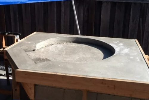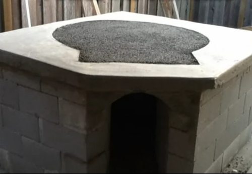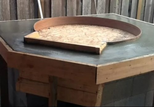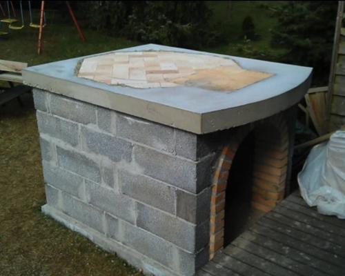 | Изливане на бетон. Бетонът се излива по периметъра на огнището и се изравнява с правило за мазилка, така че плочата да е в една и съща равнина с огнището. Когато бетонът се втвърди, кофражът се отстранява и фурната може да се положи.