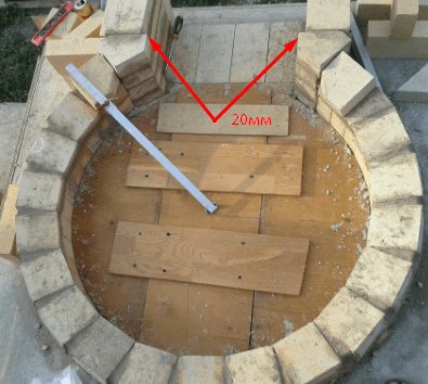 | Инсталиране на шаблона. Тук в центъра е монтирана метална ос и към нея е прикрепен сектор, изрязан от OSB лист или шперплат. Дизайнът е доста удобен, тъй като можете да поправите няколко от тези сектори и спокойно да ги преместите в частта на купола, която е поставена в момента. Самата ос се изтегля през горната част, преди да се постави последната кръгла тухла, затварящият купол и секторите лесно се достигат през изхода, дупката в центъра се размазва. |
