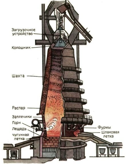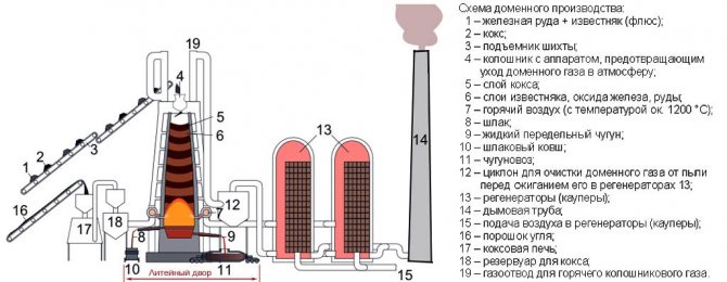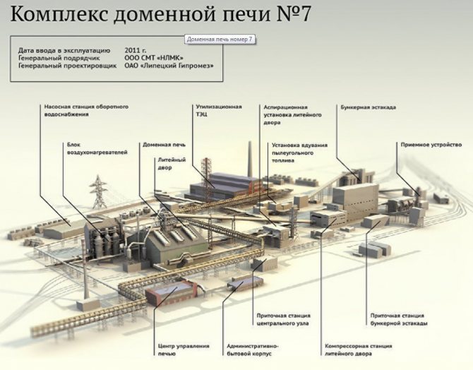 Доменната пещ е не само инсталация за производство на чугун, но и многобройни помощни агрегати. Това е система за подаване на заряд и кокс, шлака, разтопено желязо и газове, система за автоматично управление, каупери и много други.