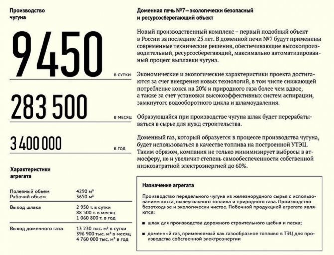 Новият комплекс осигурява производството на повече от 9450 тона чугун на ден, полезният обем на пещта е 490 кубически метра, а работният обем е 3650 кубически метра. Дизайнът на доменната пещ осигурява безпроблемно и екологично производство на чугун; доменният газ за ТЕЦ и шлака, използвани в пътното строителство, се получават като странични продукти.