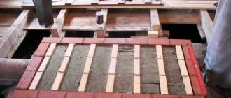 Монтаж на рамката на фалшивия таван. Рамката на подгънатия таван е прикрепена към подовите греди или към стените, изработени от дърво 100x50 с вертикална ориентация. Разстоянието между гредите трябва да съответства на ширината на изолационната плоча минус 5 mm на дистанционер.
