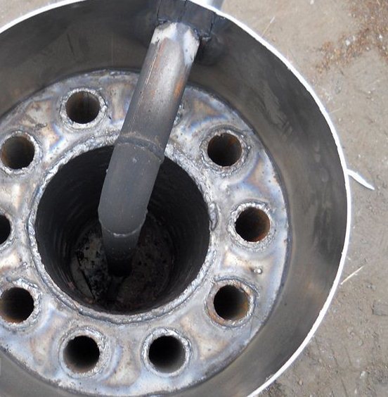 След описаните действия трябва да отрежете дъното на предварително подготвения метален резервоар с мелница. Отстрани е необходимо да се изреже дупка, която е равна на диаметъра на комина.
