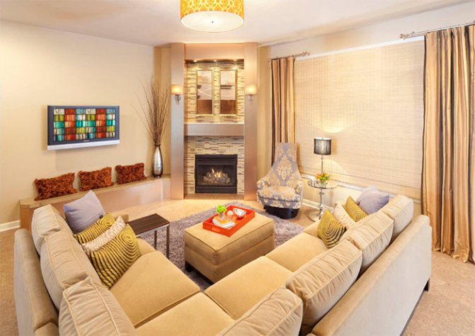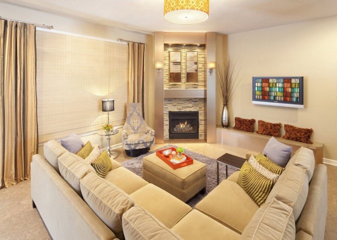 За този интериор в класически стил е избрана ъглова електрическа камина. Ако не знаете за него, е напълно възможно да го приемете за истински, особено след като най-новите модели на тези електрически уреди, имитиращи огнище, са оборудвани с приятно пращене, познато на горещите дърва за огрев. Предимството на електрическата камина е външният дизайн на камината с подиум за телевизор и рафт за инсталиране на друго електронно оборудване. Мебелите са внимателно подбрани, за да съответстват на стила на рамката на камината - тъй като тя е центърът на интериора, целият живот на тази стая я заобикаля. Трудно е да си представим тази стая без този основен атрибут и ако я замените с друга опция за стил, веднага ще загубите постигнатото настроение и чар на създадената атмосфера.