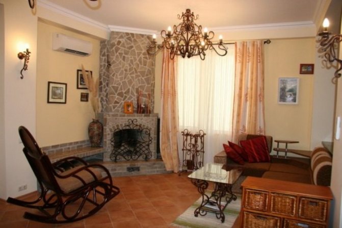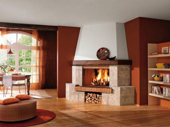 Каменна тухлена камина идеално се вписва в облицованите с дърво стени. Стаята, благодарение на централния си елемент, просто излъчва комфорт и топлина. В комбинация с перфектно съчетани мебели и ориенталска живопис, стаята е благоприятна за релакс и почивка. Ароматният дим от изгаряне на дърва изпълва околната атмосфера с мистично привличане, а топлата светлина създава безпрецедентен комфорт. Такава органична среда не е лесно да се създаде без наличието на камина в нея. Избраният тип конструкция - ъглова - също може да се счита за успешна.