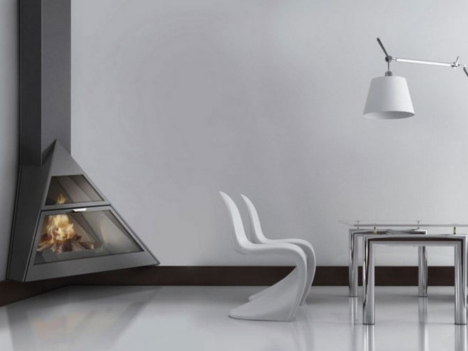 Металната ъглова камина е идеална за минималистичен интериор, превръщайки се в централен, привличащ вниманието елемент от цялостната композиция. Това не затруднява дизайнерското решение, но като че ли създава хармоничен баланс при разпределението на обектите в пространството. Тази стая ще се промени изцяло вечер или в дъждовен ден - езиците на пламъка, отразени по стените, ще създадат приказно осветление и мистерия в нея. Добре е да се задълбочите в четенето на интересна книга или да прекарате романтична вечер близо до такава печка в мълчание.