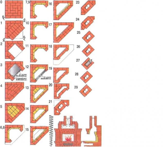 Между първия ред на основата на камината и основата се полага слой покривен материал. Освен това, стриктно съгласно проекта, в който има поръчка, се извършва полагането на камината. Поръчката е инструкция стъпка по стъпка, която ви позволява да работите въз основа на предварително разработени схеми, които са се доказали от положителната страна. Не си поставяме задачата да покрием всички съществуващи проекти, има други ресурси за това. Ще разгледаме най-простата версия на ъглова камина, с която може да се справи дори любител в бизнеса с печки.