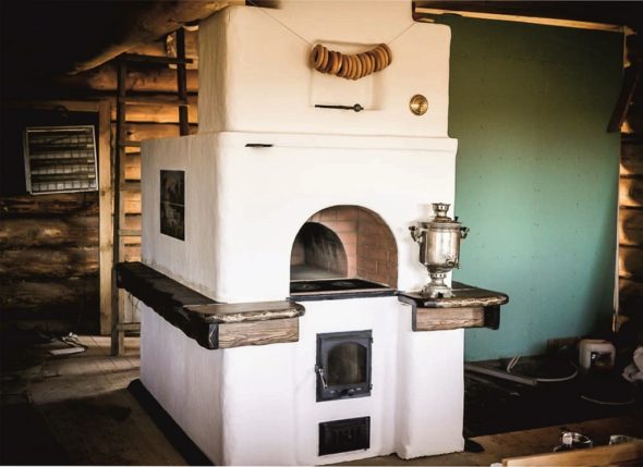- Руска печка с печка (прочетете повече) - по-усъвършенстван и удобен модел на устройството: през лятото той изпълнява функцията за готвене, а през зимата - отопление.