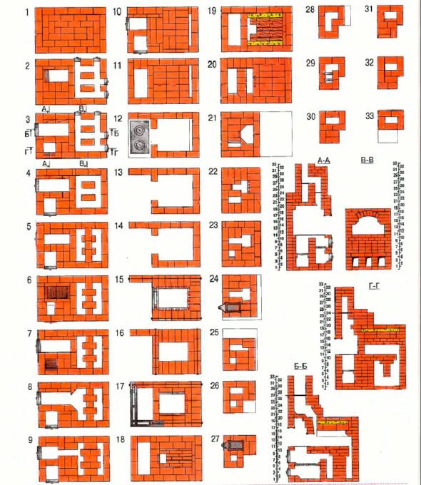 - 5-ти ред: решетката е поставена за най-малката горивна камера. За да се постави вътрешността на горивната камера, се използват огнеупорни тухли, които се полагат без използване на хоросан.