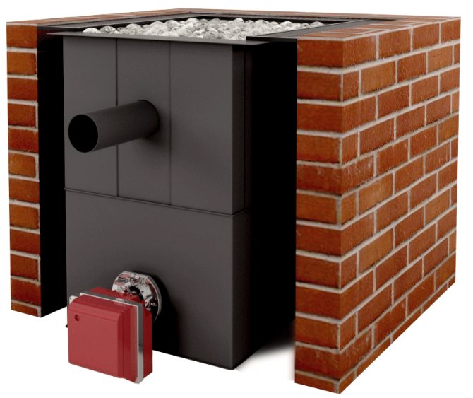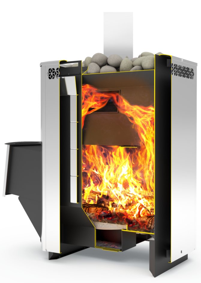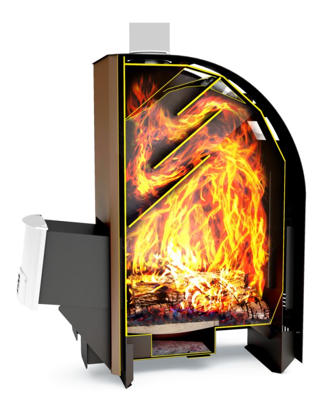 Горивната камера е направена от от неръждаема стоманаустойчиви на най-високите температури. Той е скрит зад конвектор, който изпълнява декоративна функция и осигурява ефективно отопление на помещението.