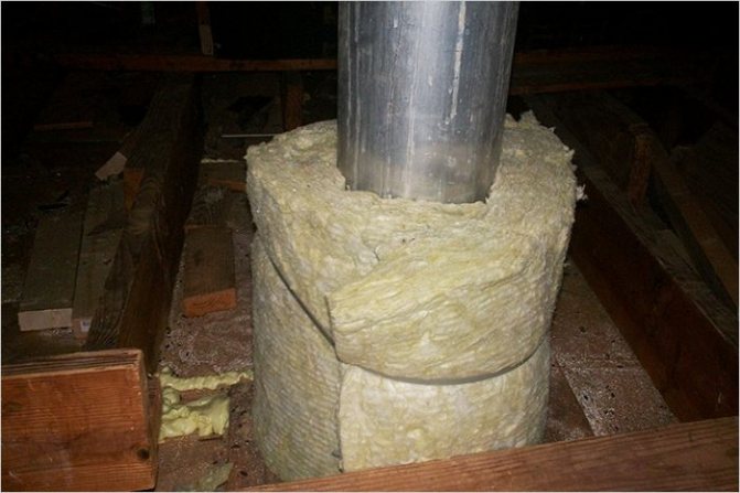 Необходима е изолация на мястото на тръбата, където топлата повърхност на комина "се среща" със студен въздух. Като правило този сайт се намира или в студено таванско помещение, или там, където конструкцията е показана на покрива.