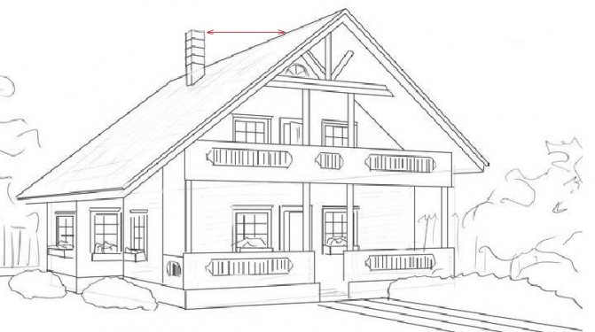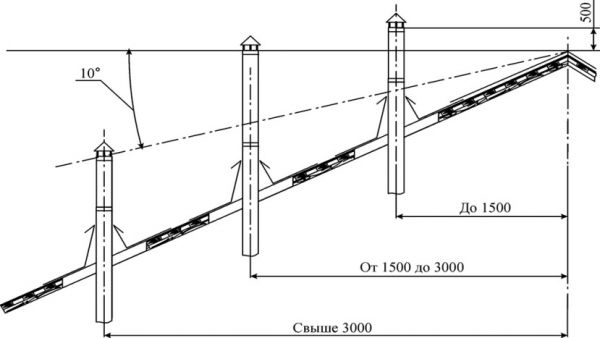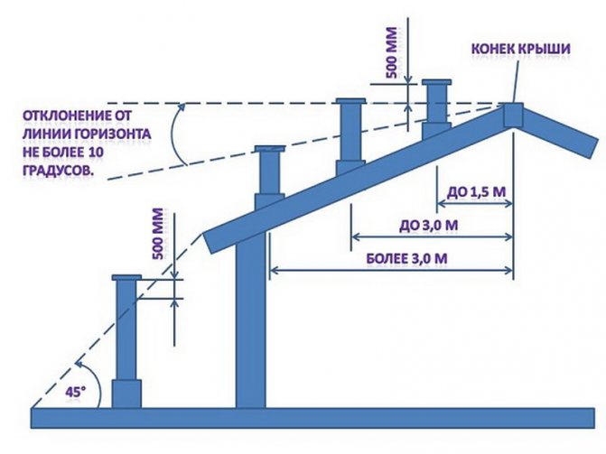 Височина на тръбата спрямо билото на покрива определено от SNiP 41-01-2003, който регулира въпросите за отоплението и вентилацията.