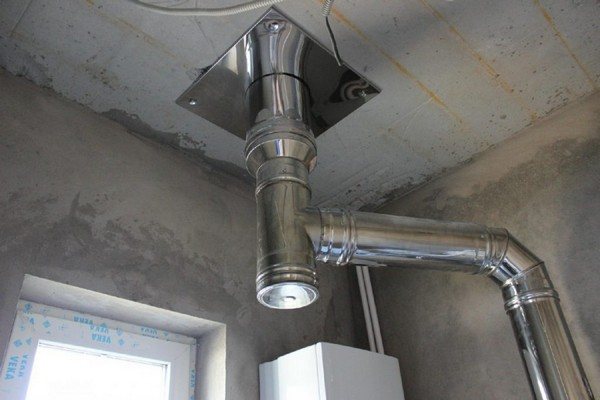 - Когато дупките в тавана, покрива са направени, можете да започнете сглобяването. На първо място, между отоплителното оборудване, тръбата е инсталиран специален адаптер.