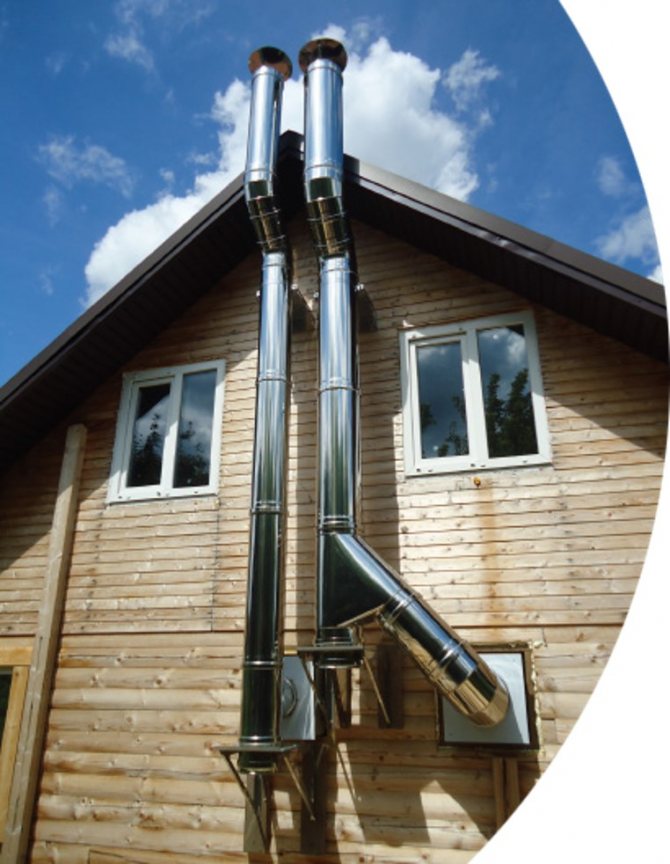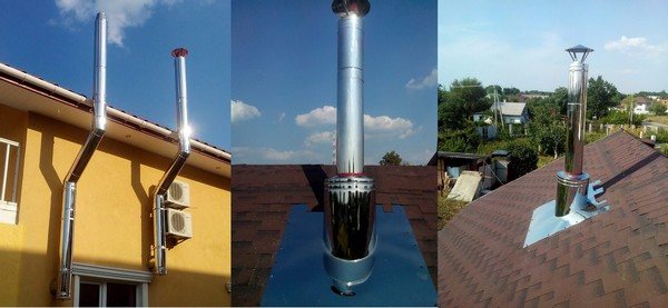 - Изход за комин от сандвич тръби през стената. Това позволява да се намали натоварването на подовете, но изисква повече материали за производството на тръбопровода.
