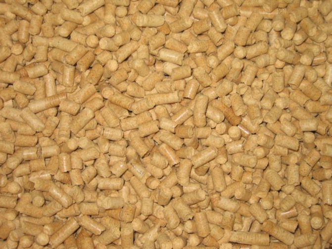 Resíduos agrícolas (cascas de girassol, milho e trigo sarraceno) também são utilizados. Turfa e palha também são matérias-primas. É um grânulo cilíndrico comprimido (comprimento 10-30 mm, largura 6-10 mm).