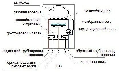 O trocador de calor pode ter um ou dois circuitos. O primeiro circuito fechado é conectado ao sistema de aquecimento, a circulação do refrigerante nele é realizada por meio de uma bomba. Um segundo circuito também pode ser instalado em uma caldeira a gás, a água do sistema de abastecimento de água passa por ele e aquece. Este circuito é aberto, a água é fornecida devido à pressão gerada pela estação de bombeamento.