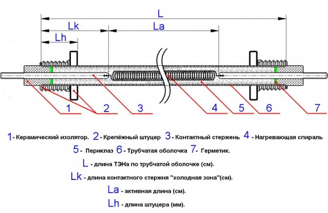 É conveniente considerar o dispositivo no exemplo de um modelo tubular. O aquecedor elétrico é um tubo de cerâmica ou metal preenchido com um condutor térmico com uma espiral localizada em seu interior. No local onde o tubo é fixado ao flange, existem buchas isolantes que impossibilitam o contato da espiral condutora com o corpo da resistência.